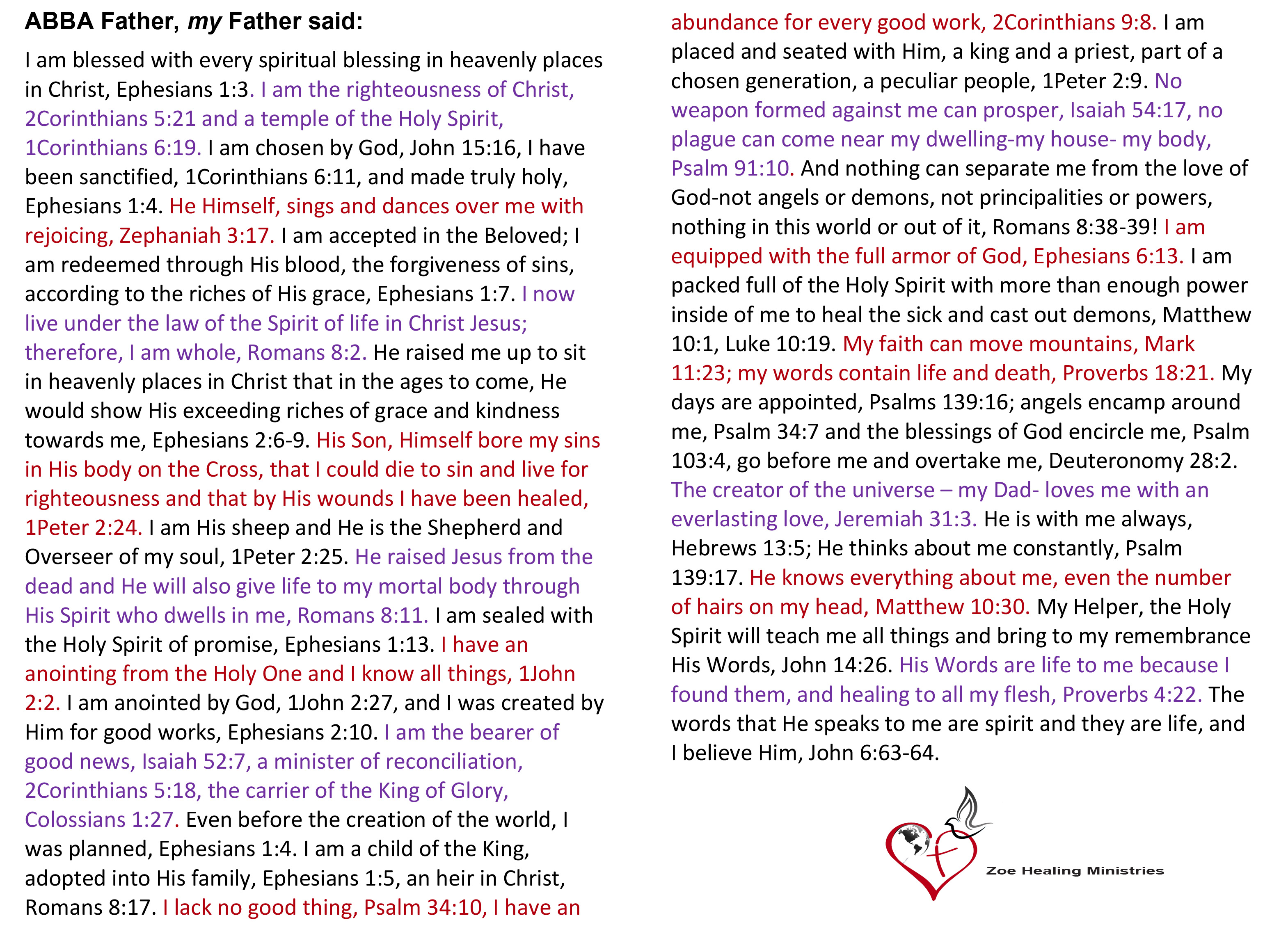 - "I am packed full of the Holy Spirit with more than enough power inside of me to heal the sick and cast out demons" -Matthew 10:1, Luke 10:19